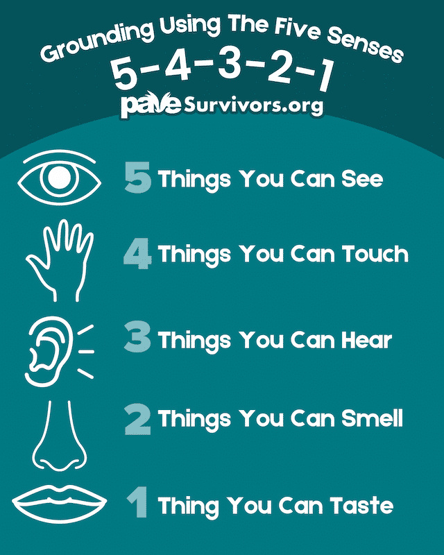 To begin, take a few paced, deep breaths. Observe your environment by going through each of your senses. It may be helpful if you say each thing you observe out loud, but it’s okay if you are unable to do so. Work your your way through your senses by counting down from five and list: